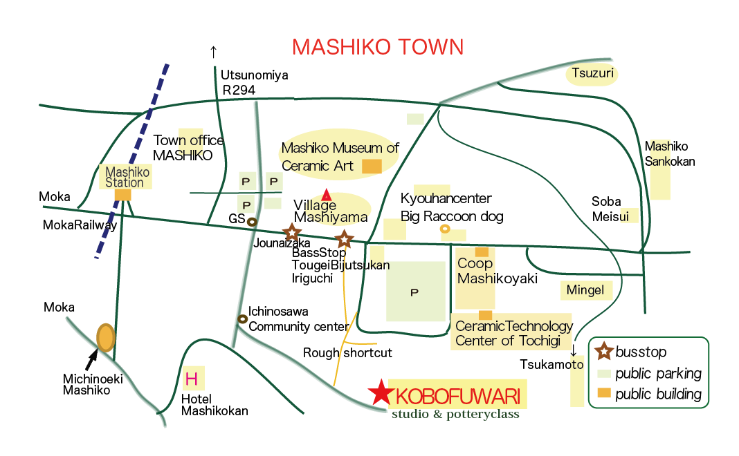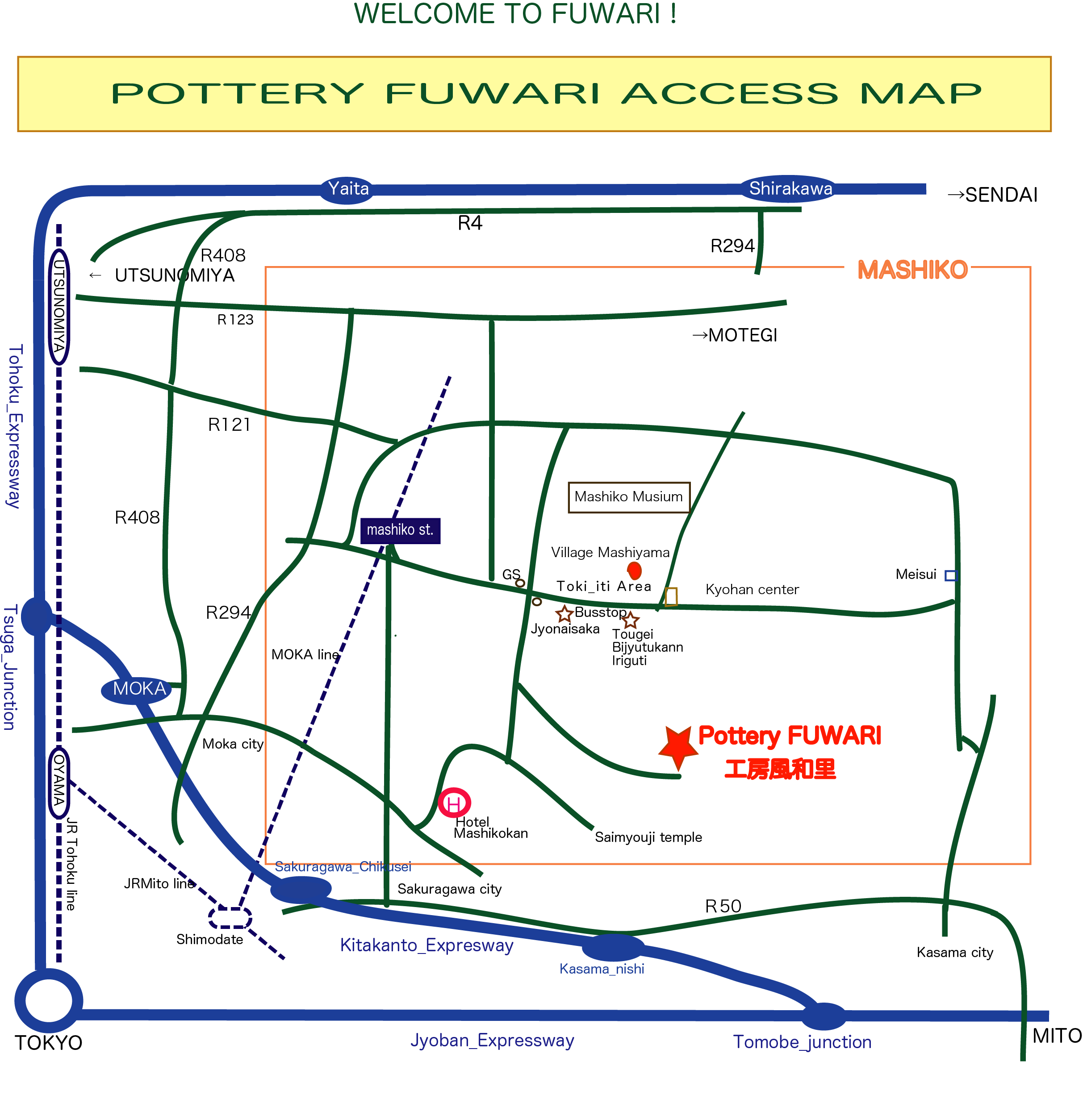 EJR Tohoku Line Oyama st. ¨ Mito Line - Simodate st. ¨Moka Line - Mashiko st. ¨ (30 mins walk)-Fuwari
